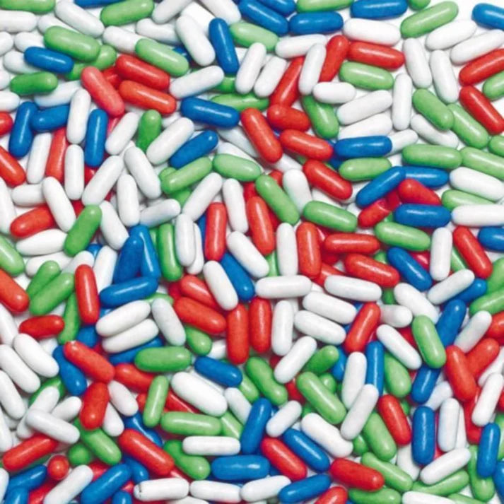 Ingrédients: sucre; sirop de sucre mélassé; farine de BLE; amidon; extrait de réglisse; maltodextrine; arôme; colorants: curcumine, carmins, bleu patenté V, carotènes végétaux; sel; émulsifiant: mono- et diglycérides d'acides gras; correcteur d'acidité: carbonate acide de sodium; agents d'enrobage: cire d'abeille blanche et jaune, cire de carnauba