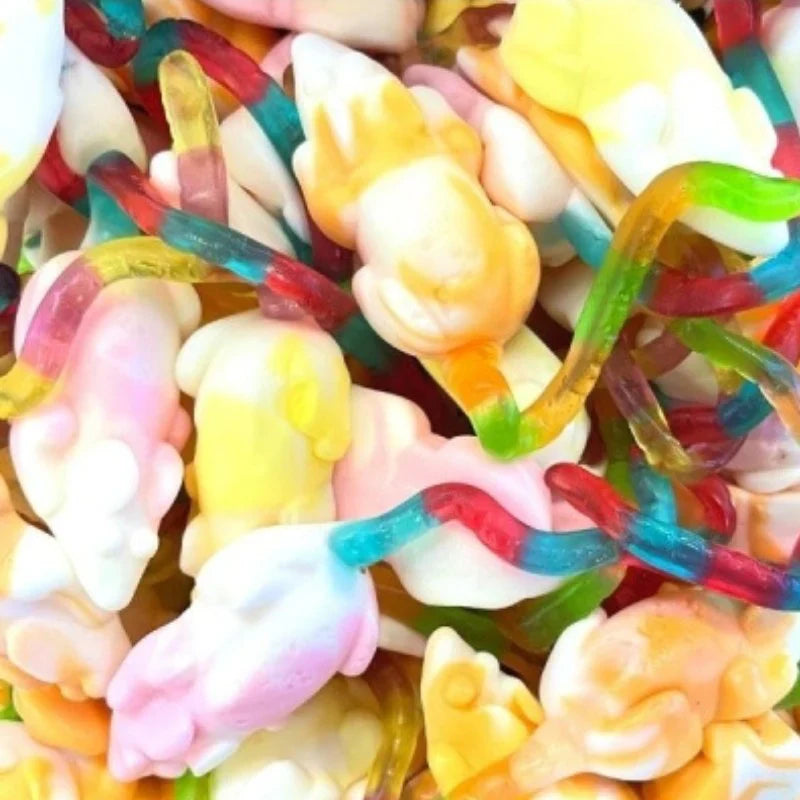 Ingrédients: Sirop de glucose, sucre, gélatine, acidifiants : acide citrique et acide lactique, gélifiant : pectine, arômes, concentré de fruits et préparation d’extrait végétal (curcuma, paprika), colorants (carmin, curcumine, bleu patenté V), huile végétale (huile de coco, huile de graine de palme), agent de démoulage : cire d'abeille (jaune et blanc), cire de carnauba.
