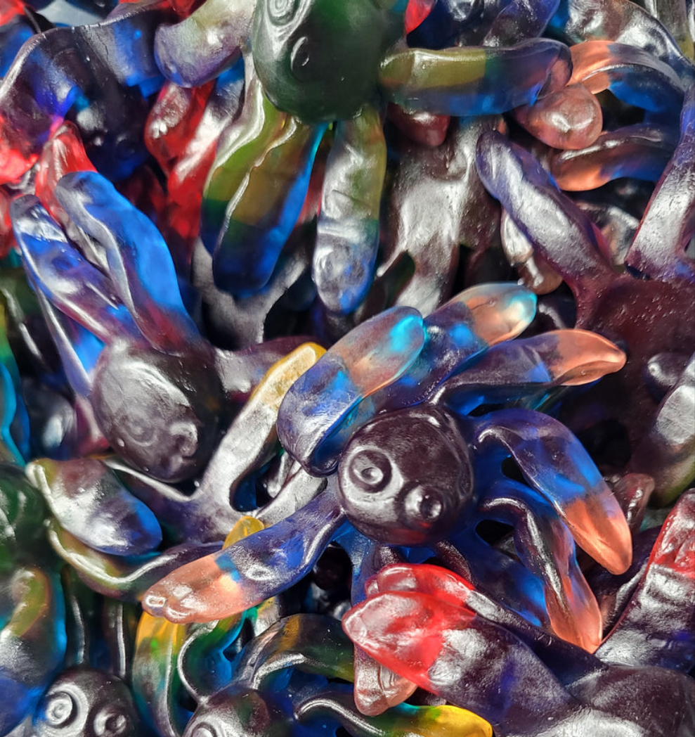 Sirop de glucose, sucre, gélatine, acidifiants : acide citrique, acide lactique, arômes, colorant : carmin, curcumine, bleu brillant FCF, huile de palme, agents d'enrobage : cire d'abeille, blanc et jaune, cire de carnauba.